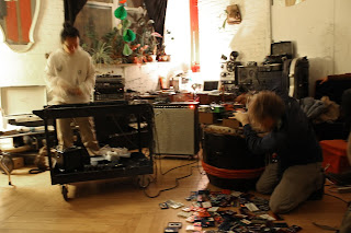 Even if their pallette is similar, what they are doing is so different. Lucas moves frantically, while Aki moves languidly. You hear Lucas jostling tapes and knocking at his mixer, you actually hear his body through his amplified breath! Aki quietly selects a few tapes, and moves around, it seems, to hear better. Back and forth, from foot to foot, or slowly from amp to amp. Both employ feedback, and emerge from scenes where improvisers use foot pedals, but in the way they cut their loops, they indicate different background traditions. Aki points to the tape loop tradition of Terry Riley, that officially passed to Fripp and Eno and melted away digitally into ambience; and esoterically (albeit syncretized with the cut-tape techniques of Burroughs & Gysin) passed to Industrial Music. Lucas, with his rapid moving back and forth from deck to deck and use of the fader points to scratching DJs — like DJ Klever or the great Babu (who coined the world turntablism).